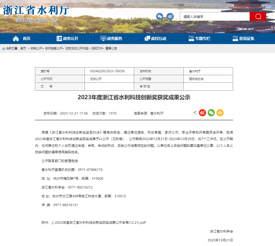 喜報 | 我院3項成果榮獲2023年度浙江省水利科技創(chuàng)新獎!