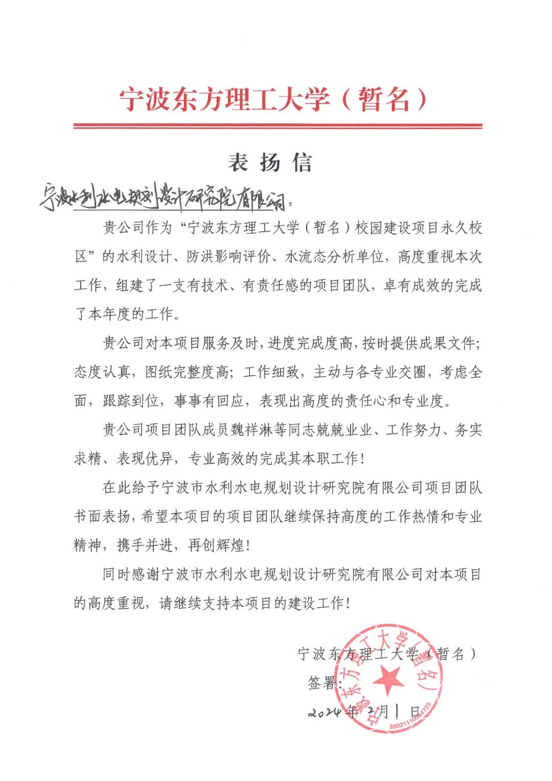 發(fā)布日期:2024.02.07 辭舊迎新之際,寧波市水利院收到寧波東方理工大學(xué)的感謝信。信中提到,我院在寧波東方理工大學(xué)(暫名)校園永久校區(qū)建設(shè)項目中,派出的項目團隊高效、專業(yè)、及時地做好技術(shù)支撐服務(wù)工... -