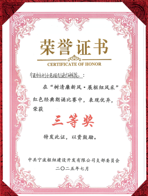 為慶祝中國(guó)共產(chǎn)黨成立104周年,2025年7月1日,寧波樞紐建設(shè)開發(fā)有限公司隆重舉行了“紅動(dòng)樞紐·同心共建”迎“七一”主題黨建活動(dòng)。作為寧波樞紐片區(qū)重要參建單位和黨建聯(lián)盟成員,我院黨總支書記、副院長(zhǎng)王洪霞帶隊(duì)參與了本次活動(dòng),并且,我院兩位青年職工攜選送作品在“樹清廉新風(fēng)·展樞紐風(fēng)采”樞紐片區(qū)紅色經(jīng)典朗誦比賽中榮獲三等獎(jiǎng)。