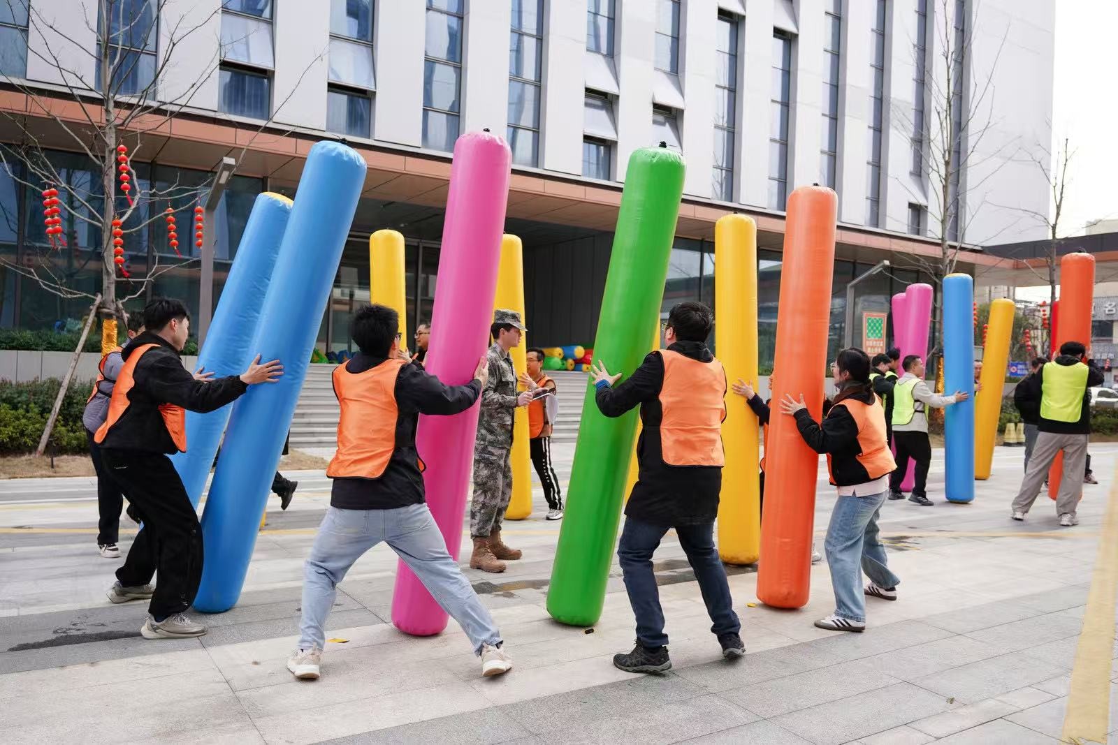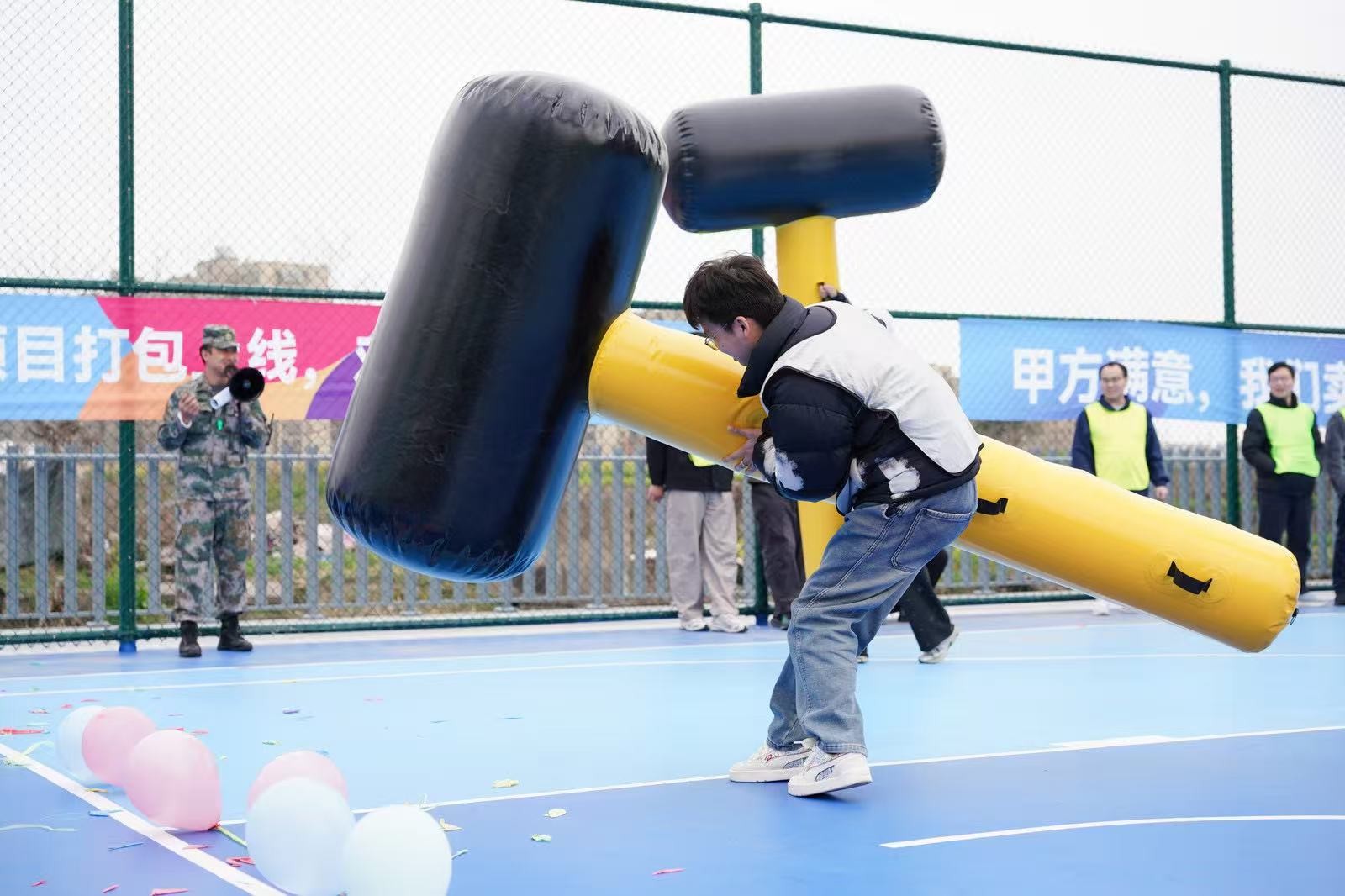 在“南水北調(diào)”項(xiàng)目中,隊(duì)員們手持PVC管接力運(yùn)水,5分鐘內(nèi)爭(zhēng)分奪秒,讓水流在管中傳遞涌向重點(diǎn),仿佛將團(tuán)隊(duì)的信任與責(zé)任匯聚成河。“龜兔賽跑”則讓隊(duì)員們化身可愛的“烏龜”和“兔子”,在賽道上你追我趕,妙趣橫生。“鴻運(yùn)亨通”需要8人共同托舉大球折返跑,大家步調(diào)一致,齊頭并進(jìn)。“一錘定音”環(huán)節(jié),隊(duì)員們揮動(dòng)充氣大錘敲破氣球,每一聲“砰”響都引來(lái)陣陣喝彩。