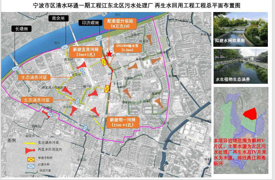 寧波市區(qū)清水環(huán)通一期工程江東北區(qū)污水處理廠再生水回用工程為增加河網(wǎng)水環(huán)境用水量,提升河網(wǎng)水體透明度及水體質(zhì)量,配套新建廠內(nèi)泵站1座,新建河道攔河鋼壩2座,新建再生水回用管道約1.1km,管道直徑約DN1000。水泵加壓后,通過(guò)引水管道將廠內(nèi)的水引至廠區(qū)外,與廠外的的輸水管道相接,管道沿后西河布置,并在直落河與明一河中設(shè)置兩個(gè)排口,出口各設(shè)置一座閥門(mén)井及一座攔河鋼壩。同時(shí)在直落河排口下游、明一河排口下游新建生態(tài)水源涵養(yǎng)區(qū)4.9km,配套岸線修復(fù)若干。