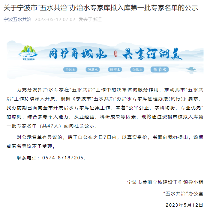 為充分發(fā)揮治水專家在“五水共治”工作中的決策咨詢服務(wù)作用,推動(dòng)我市“五水共治”工作持續(xù)深入開展,根據(jù)《寧波市“五水共治”辦治水專家?guī)旃芾磙k法(試行)》要求,寧波市美麗寧波建設(shè)工作領(lǐng)導(dǎo)小組“五水共治”辦公室前期已面向全市開展治水專家?guī)煺骷ぷ鳌?/span>