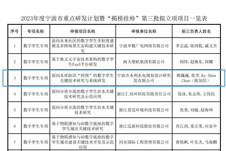 近日,2023年度寧波市重點研發(fā)計劃暨“揭榜掛帥”第三批擬立項項目公示,我院“面向水庫防洪‘四預’的數(shù)字孿生關鍵技術研究與系統(tǒng)研發(fā)”項目成功上榜。