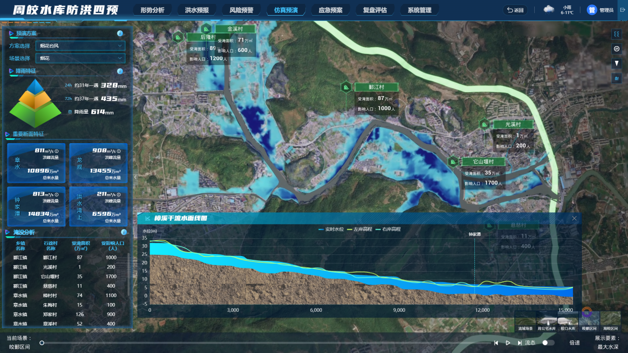 入庫1800多場歷史臺風信息,通過臺風路徑相似度匹配,獲取歷史臺風周公宅水庫、皎口水庫庫區(qū)降雨網(wǎng)格化數(shù)據(jù),為預(yù)報和調(diào)度決策提供參考。建設(shè)鄞江流域產(chǎn)匯流模型、梯級水庫聯(lián)合調(diào)度模型和水庫下游一二維耦合水動力模型,通過水庫調(diào)度對下游防洪影響的正向預(yù)演,以及對上游庫區(qū)淹沒和大壩自身安全的逆向推演,動態(tài)推薦多目標優(yōu)化調(diào)度方案,有力支撐水庫從前期預(yù)泄、中期錯峰到后期攔蓄的全過程調(diào)度決策。將傳統(tǒng)的各水庫獨立預(yù)報的流程進行重塑,實現(xiàn)兩座水庫工作人員在同一平臺上協(xié)同操作、實時計算與快速分析,聯(lián)合預(yù)報調(diào)度方案的制定時間從原先的10分鐘縮減至目前的1—2分鐘,顯著提升了洪水預(yù)報效率。同時,周公宅水庫、皎口水庫高精度的洪水預(yù)報,為寧波市甬江流域一體化調(diào)度提供較為精確的上邊界條件,提高了下游平原河網(wǎng)的洪水預(yù)報精度,在近年的流域防洪中發(fā)揮了很好的實戰(zhàn)作用。